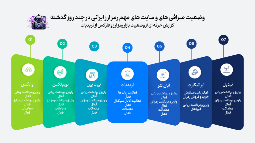 طبق آخرین بررسیها، تعداد قابلتوجهی از صرافیهای ایرانی اکنون قادر به ارائه واریز و برداشت ریالی و رمزارزی، و حتی انجام معاملات هستند، حتی اگر بعضی از زیرساختها با تاخیر یا محدودیت روبهرو شده باشد.